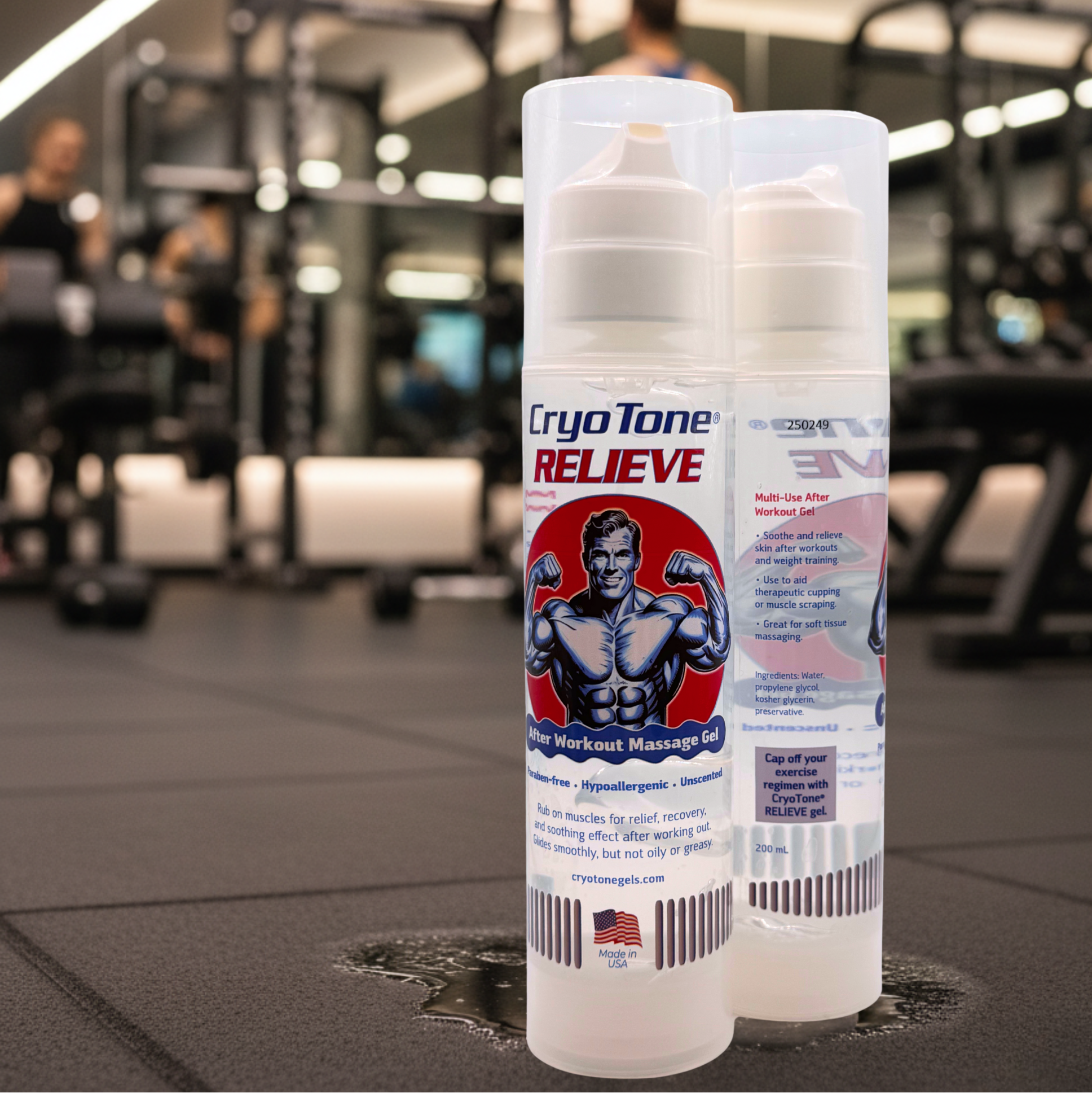 CryoTone is a post-workout multi-use gel that is applied to the skin and rubbed over sore muscles after exercising, weightlifting, and/or strength training. It is used to enhance therapeutic soft tissue massages performed by hand or with percussion massage guns.
